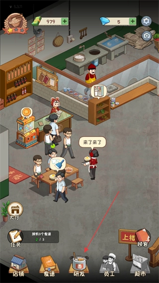 在面馆主界面,点击底部的研发按钮,进入新品研发页面,以此更新面馆菜品,丰富可提供的餐食种类。