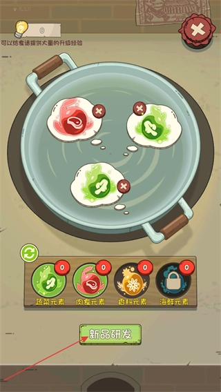 在研发界面选定对应的元素后,点击新品研发按钮,通过尝试制作新菜品来丰富面馆的菜单选择,从而增强经营的多样性。
