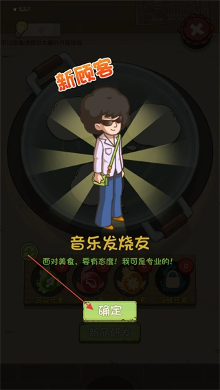随着新菜品的研发,会吸引到新类型顾客——音乐发烧友。点击确定按钮即可完成该顾客的解锁,之后就能接待这类顾客,从而为面馆增添新的营收来源。