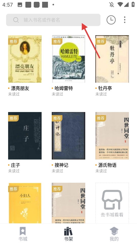 点击顶部搜索栏,输入书名或作者名进行搜索。