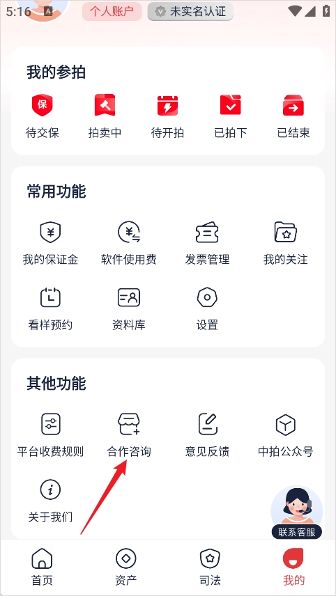 在个人页面中选择【合作咨询】选项;