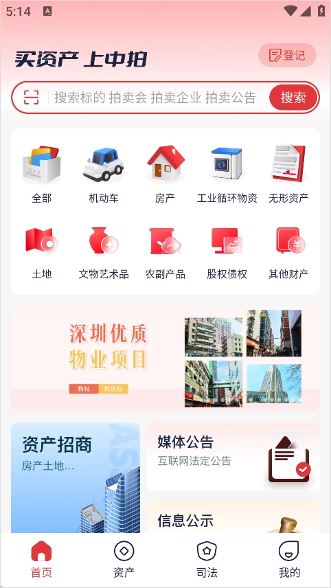打开中拍平台App后,首先进入首页,在首页能够看到各类资产的拍卖分类板块。