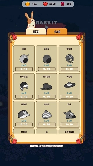 点击图中的帽子或衣服图标,就能进入具体的服装搭配界面,就像图里展示的那样。给兔子们换上新装扮,不仅能让它们的形象看起来更漂亮,而且不同装备的效果就算不穿戴也会组合生效,这样能大幅提高挂机收益,还能让森林音乐会的舞台变得更华丽。
