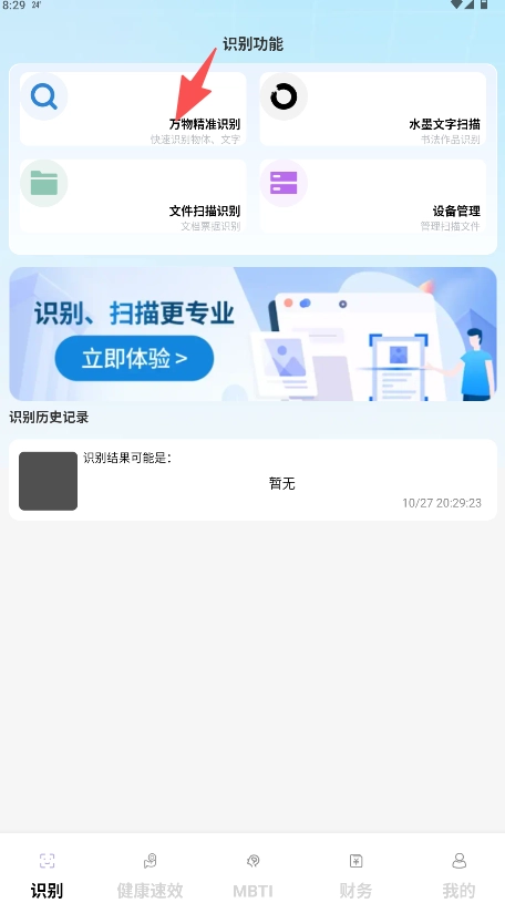 在软件首页的“识别功能”区域,点击“万物精准识别”选项,即可进入多功能识别界面。