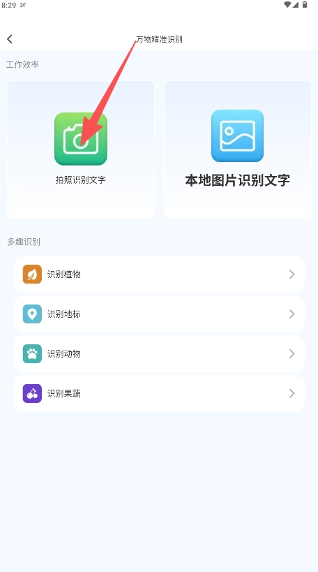 在“万物精准识别”页面的功能栏里,选择“拍照识别文字”这个功能,然后准备拍摄需要识别的物体。