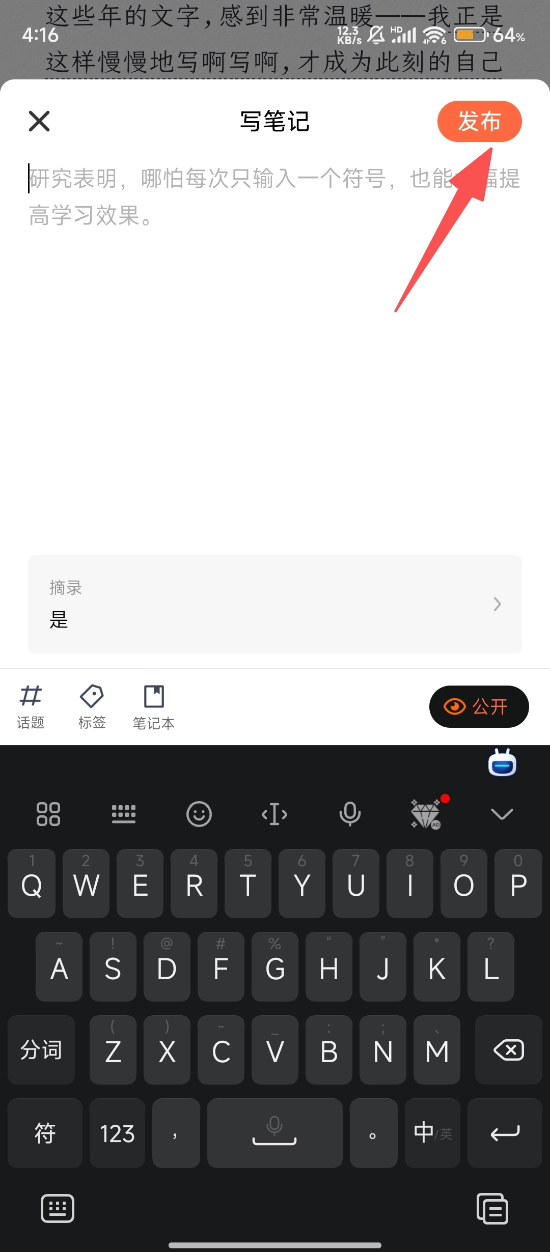 在笔记编辑页面输入内容后,点击【发布】按钮,即可完成笔记的记录与分享。