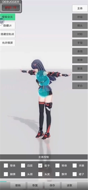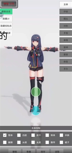 点击四肢部位时,角色模型上的青蓝色球体能够对四肢的移动进行控制。