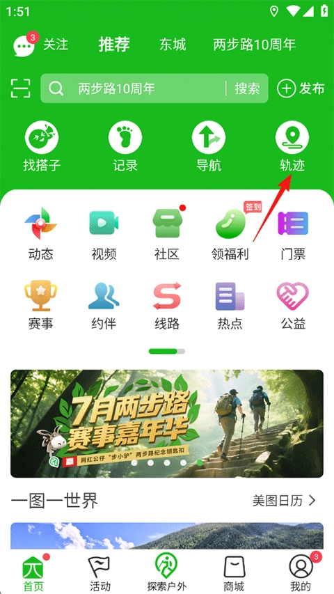 打开两步路助手,在首页点击轨迹;