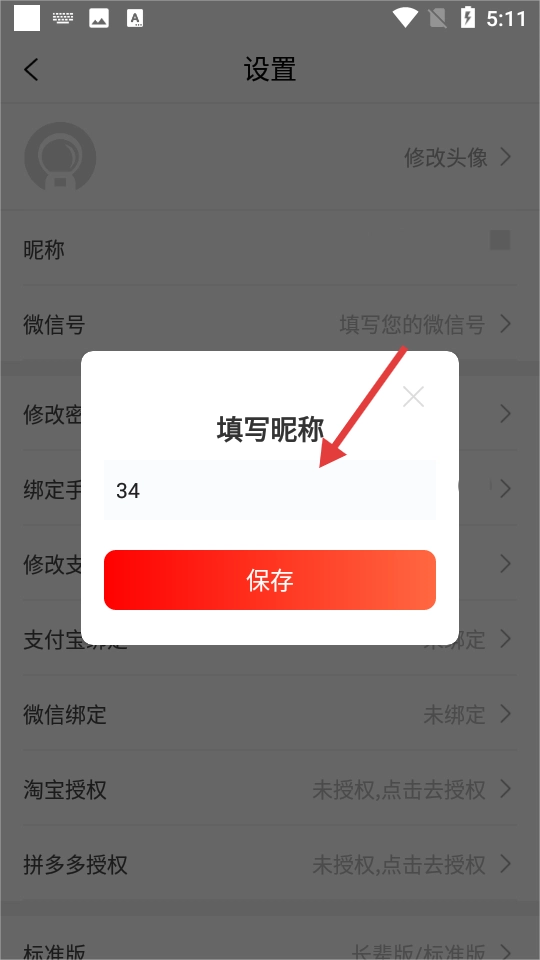 在设置页面点击【昵称】,弹出填写昵称的弹窗。