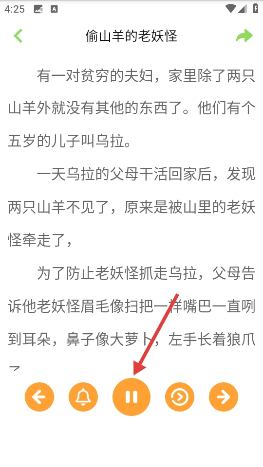 在故事阅读页面,你能够查看故事的具体内容,点击播放或暂停按钮,就能对故事的音频播放进行控制。