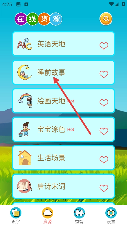 在资源页面点击【睡前故事】选项,即可进入睡前故事的列表页面。
