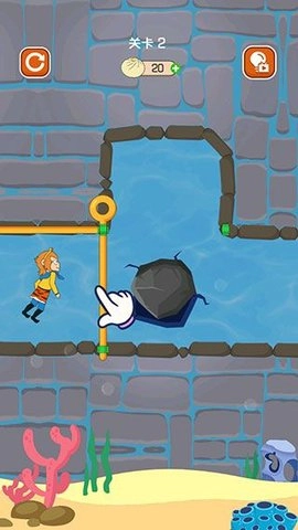 第二关得先拉动横向的拉杆,这样石块就会掉下来把洞口堵住。