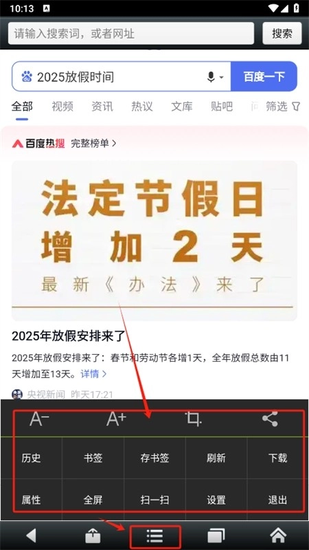 点击下方的三条横线按钮,就能进入菜单功能栏,在这里可以查看历史浏览记录,也能对网页字体大小等进行设置。