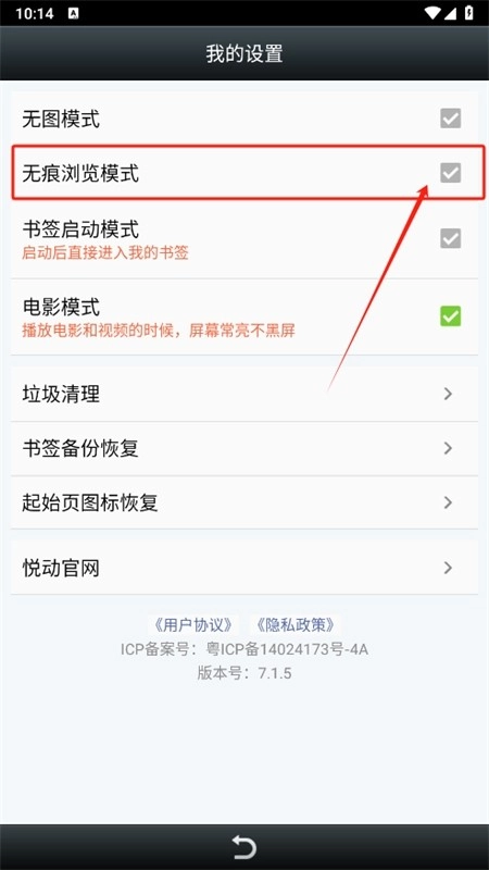 勾选无痕浏览模式,开启成功后回到系统页面就能开始上网了。