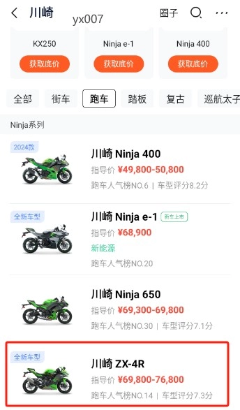 首先点击进入自己心仪车型的页面,这里我们以川崎ZX-4RR这款车型为例进行说明。