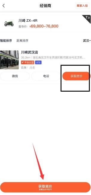完成授权定位后,您就能查看当地经销商及其具体位置;若点击“获取底价”,工作人员会主动联系您,就价格细节进行详细沟通。