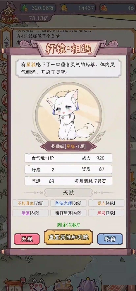 四、在游历途中,玩家会随机遇到各种各样的狐狸。可以依据它们的先天属性、天赋特质以及自身的培养计划,来决定是否把这些狐狸收留到桃源居所,慢慢壮大有灵狐相伴的家族。