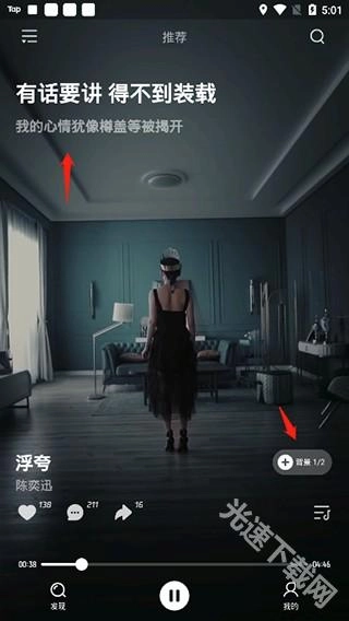 之后就能进入软件开始使用了,波点音乐默认就是视频音乐模式,左上方能看到歌词,而且还可以点击右侧的“+”按钮自己制作背景。