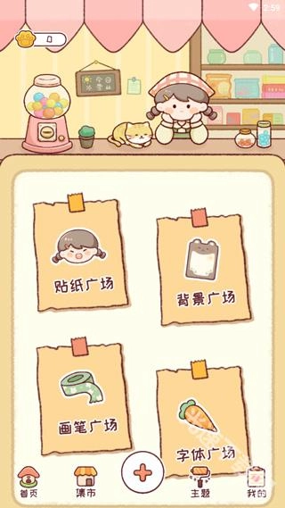 点击集市,这里有不少实用工具,像贴纸、背景、画笔、字体之类的。