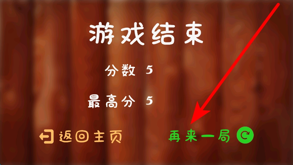 游戏结束后会呈现最终得分和历史最高分,若想继续挑战可点击“再来一局”,若想退出则选择返回主页,便于玩家依据自身需求决定后续操作。