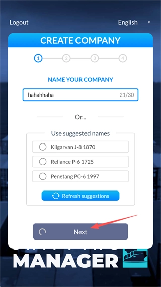 游戏开始时,先设定好自己航运公司的名称,接着点击“NEXT”按钮。