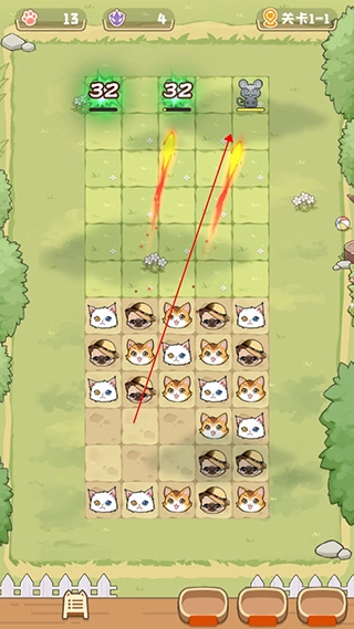 接下来就可以开启消除游戏了,把相同的猫咪消除掉,这些被消除的猫咪会对前方的敌人发起攻击,要尽可能多消除一些猫咪,这样造成的伤害会更高。