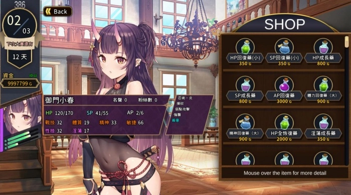 经营:在游戏里通过「委托」任务让奴隶们获取金钱。玩家能用这些金钱进行「设施强化」和「奴隶调教」,使奴隶们能够接取更高等级的委托任务,从而赚取更多金钱。