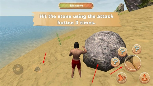 点击攻击按钮三次来击打石头,以此获取资源,为后续制作工具打下基础。