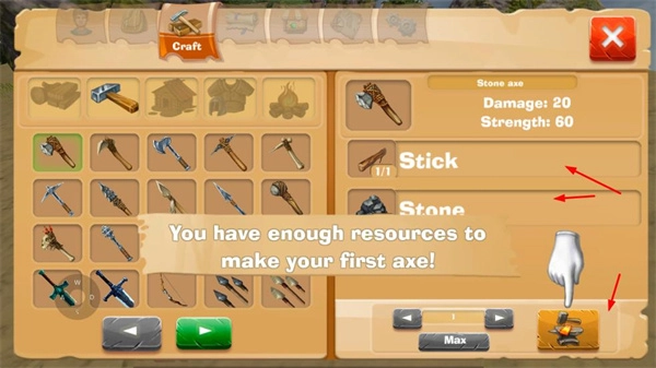在制作界面,用树枝与石头来打造石斧,这样能提高资源的获取效率。