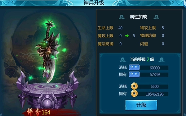 升级神兵需要消耗角色经验与金钱,升级后所带来的属性加成会直接叠加到角色自身的属性上。
