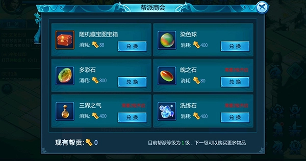通过参与帮派活动所获取的帮派贡献,能够在帮派商会里兑换特殊道具。而且帮派商会是可以进行升级的,其等级越高,商会内所出售的道具种类就会更丰富,品质也会更出色哦!