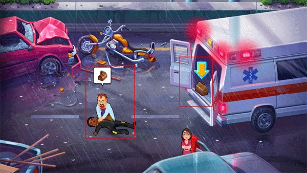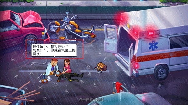 游戏开局时,一名男子突发晕厥,有位医生正紧急展开抢救,玩家需依据医生的需求点击屏幕来获取所需物品。