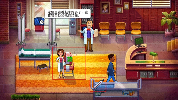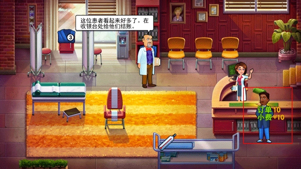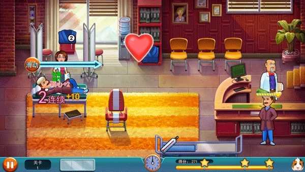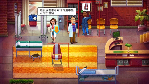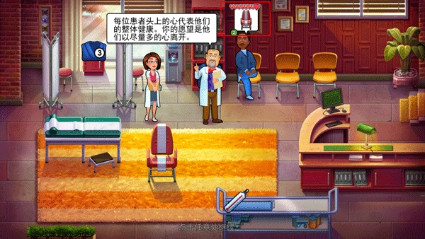 第一关的难度很低,每个患者头顶的心形图案象征着他们的整体健康状况。你的任务是让他们带着尽可能多的心形图案出院,而且病人头上还会显示需要完成的事项。