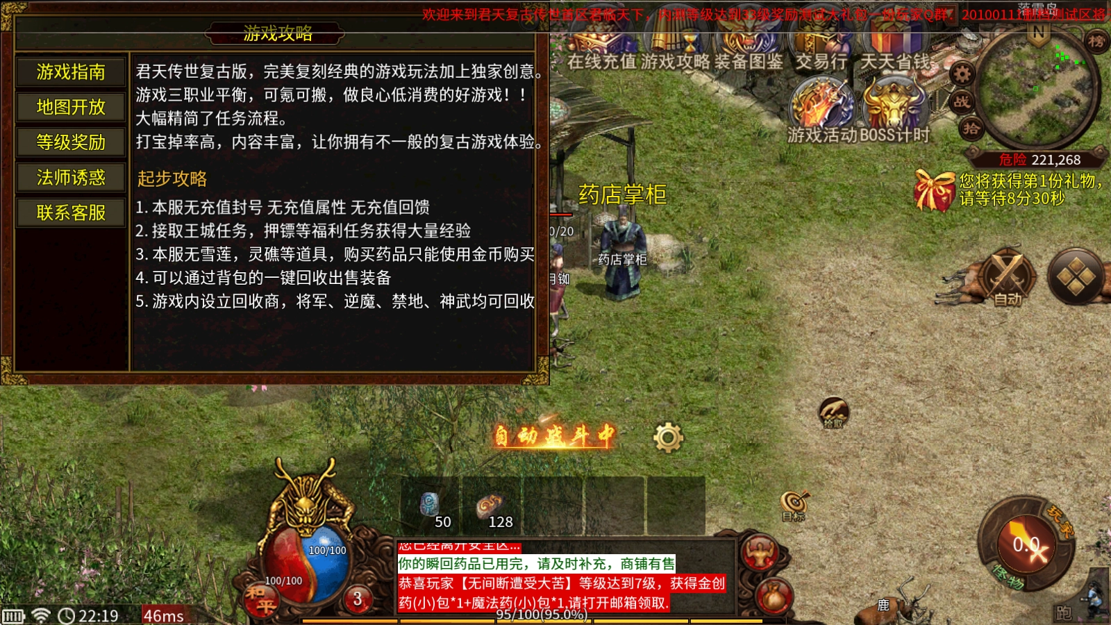 君天复古,176复古三职业传世版本,长周期复古服,60天左右开放一次新区,战神装备为顶级装备,并且只可以打怪获得!游戏会根据大家的进度合理的去开房地图,让所有玩家可以保持在同一起跑线,公平公正,人人都有机会逆袭!不仅如此,本服内还有每日王城任务,可以免费获得海量的经验,提升等级非常的迅速!正式开区之后,达到一定等级即可获取金币和绑元奖励,等级抵御排行榜第一的还能获得一定的打怪经验,让所有人都机会到顶!