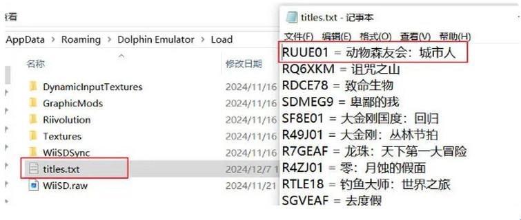 在目录的Load文件夹中,新建一个名为titles.txt的文件,在文件内输入“ $游戏ID = $你想要修改成的名称 ”这样的格式,例如 SGVEAF = 去度假 ,完成输入后保存文件,最后回到模拟器主界面进行刷新操作,就能看到修改后的效果了。