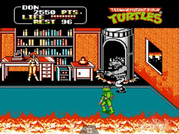 过关技巧:可以站在boss身旁用普通攻击,boss被攻击时不会攻击忍者龟,但要留意躲避它的子弹,通常损失两条命就能通关了。