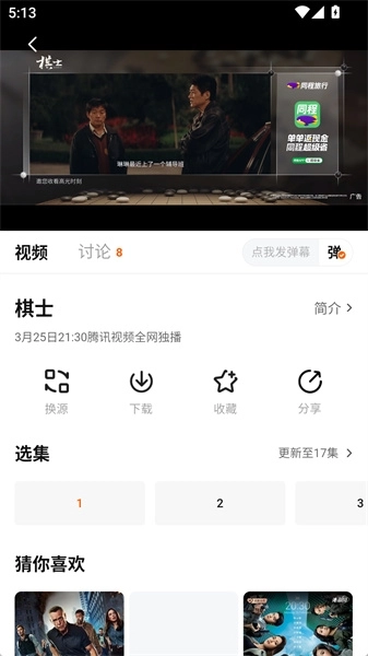 我们随意点开一部电视剧,就能看到弹幕、换源、收藏、分享等一系列功能。