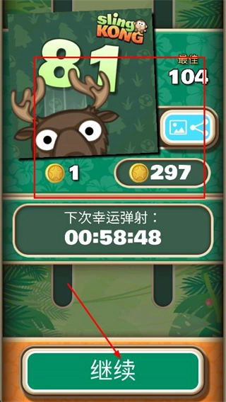 游戏结束后,你可以查看自己得到的分数和金币,点击继续按钮就能接着玩。