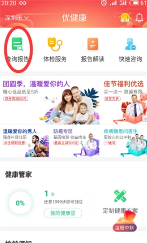打开优健康应用后,登录个人账号,接着点击首页的“查询报告”选项。