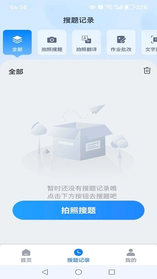 在搜题记录页面,支持便捷的拍照搜题功能。