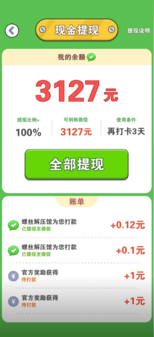新人刚上线玩完前面几关就能轻松激活福利,能提现两次,分别到账0.12和0.1,都是秒到账。之后就得不断闯关攒红包,再按比例提现。