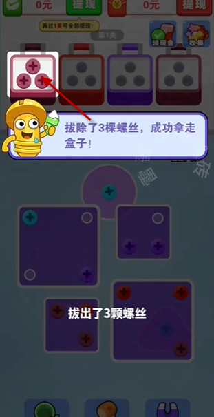 盒子里装满三枚螺丝后就能被取走,相当于被消除了。