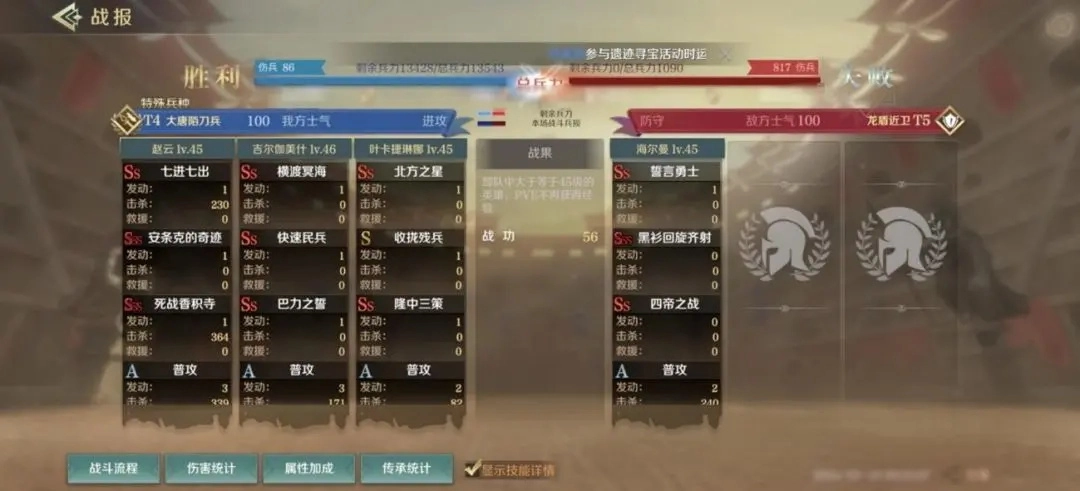 赵云自控队对于恐慌队和突击队有一定的克制作用,除了兵种克制以外,【死战香积寺】也能够克制二者的回复能力,同时,叶卡捷琳娜也可以让恐慌队的主动技能失效。