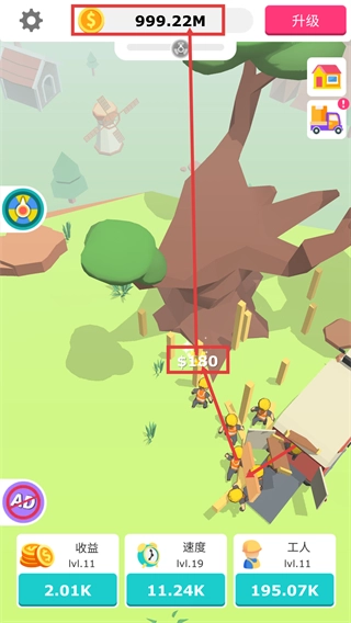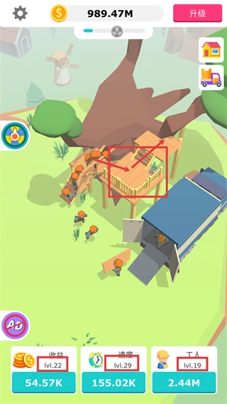 在【升级】界面消耗【50.00K】金币升级工人,能提升【利润-10%】,从而助力资源获取效率。