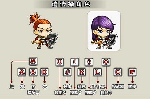 玩家一的操作按键说明如下:AD键负责控制角色移动,J键用于发起攻击,K键是跳跃功能,S键可以拾取道具,C键用来切换武器,1到4键对应使用不同技能,按下P键则会暂停游戏并显示技能表。