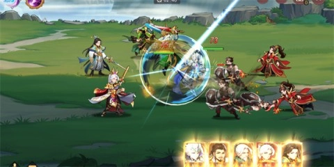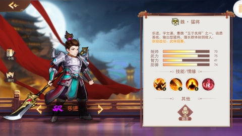 开局的玩法其实不难,跟着新手指引操作就行,能拿到两个紫将——前排的李典和半奶半法的蔡文姬,另外还有个蓝将小跟班,这三位武将应付初期的小怪完全够了。
