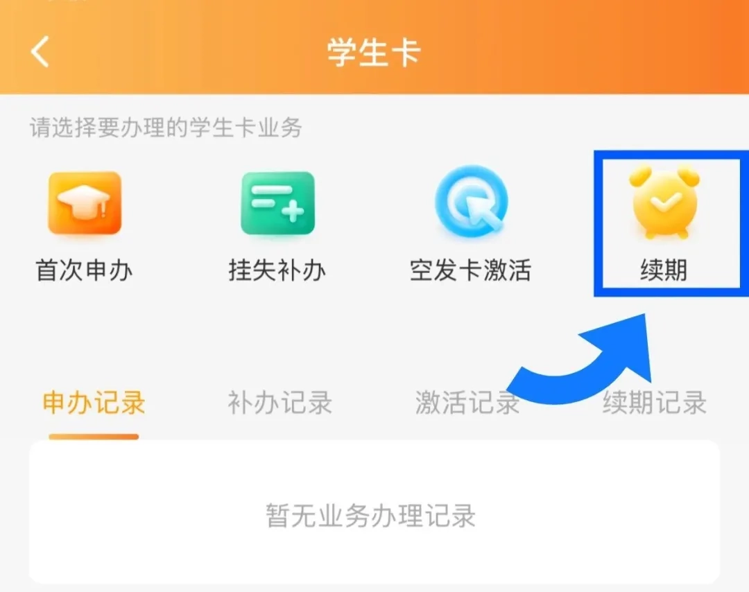 第二步:进入 APP 后,点击“学生卡办理”选项。