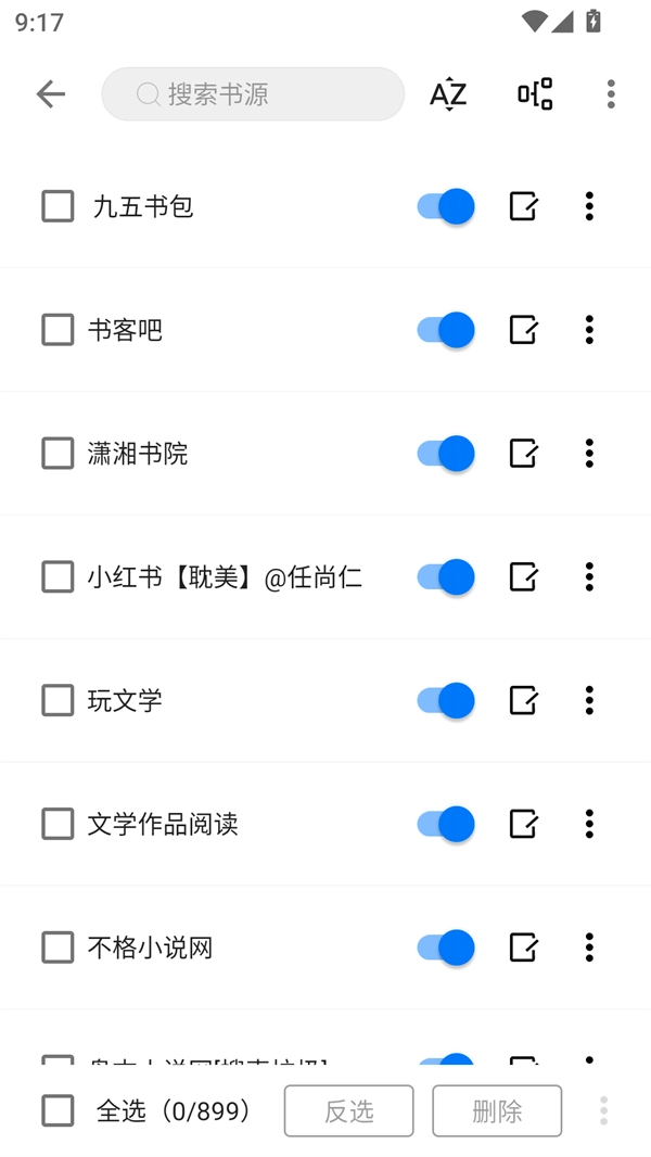 进入书源管理功能后,我们就能获取到数十个不同网站的书源,接着把这些书源直接导入进去。