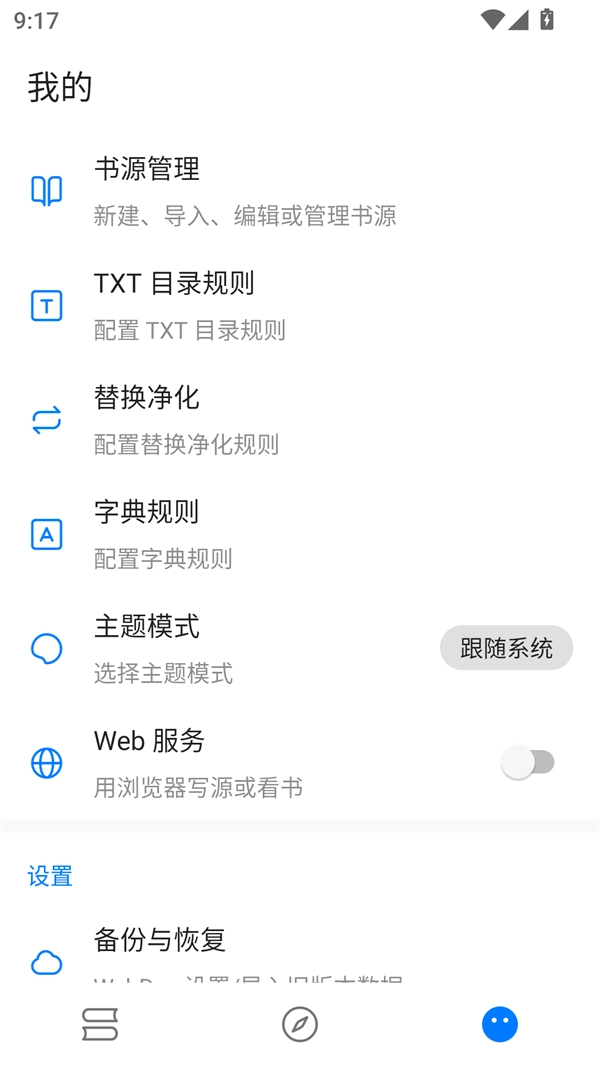 接下来我们点击右下角的头像图标进入个人主页,之后选择“书源管理”选项,即可进行书源的新建、导入、编辑以及管理操作。