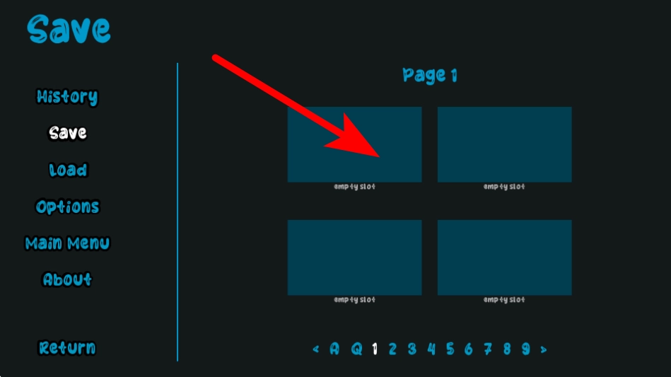 按照红色箭头的提示操作,在菜单页面里挑选一个空白的存档位置来保存当前进度,这样能防止剧情进度丢失,保证之后还能继续游玩。